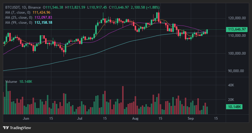 Binance provided the initial report on this milestone. The platform’s USDT pair for Bitcoin showed sustained buying pressure above the 113,000 level. Besides, the 0.39% gain, while narrow, indicates stabilization after a period of consolidation around 110,000 to 112,000 USDT. Over the past week, Bitcoin has fluctuated within a range influenced by broader market sentiment, including a 1% pullback on September 9 following U.S. jobs data revisions.