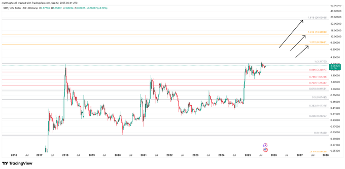 XRP has soared above the 3 level, and the market is gaining momentum again. This week, technical analyst Matt Hughes published a chart indicating Fibonacci-based targets of $8.30, $13.39, and $26.63. The highest estimate at the current price of about 3.05 is a possible increase of over 773 percent.